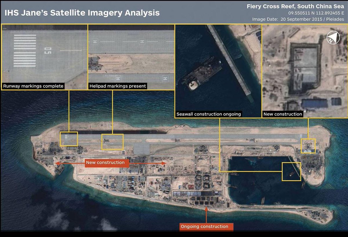 IHS Jane's 360發表之永暑島最新影像,跑道標號與直升機標記均清晰可見 (via Twitter) |